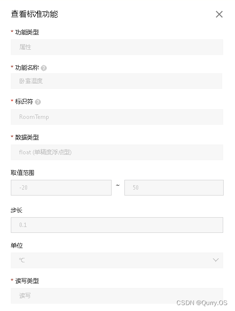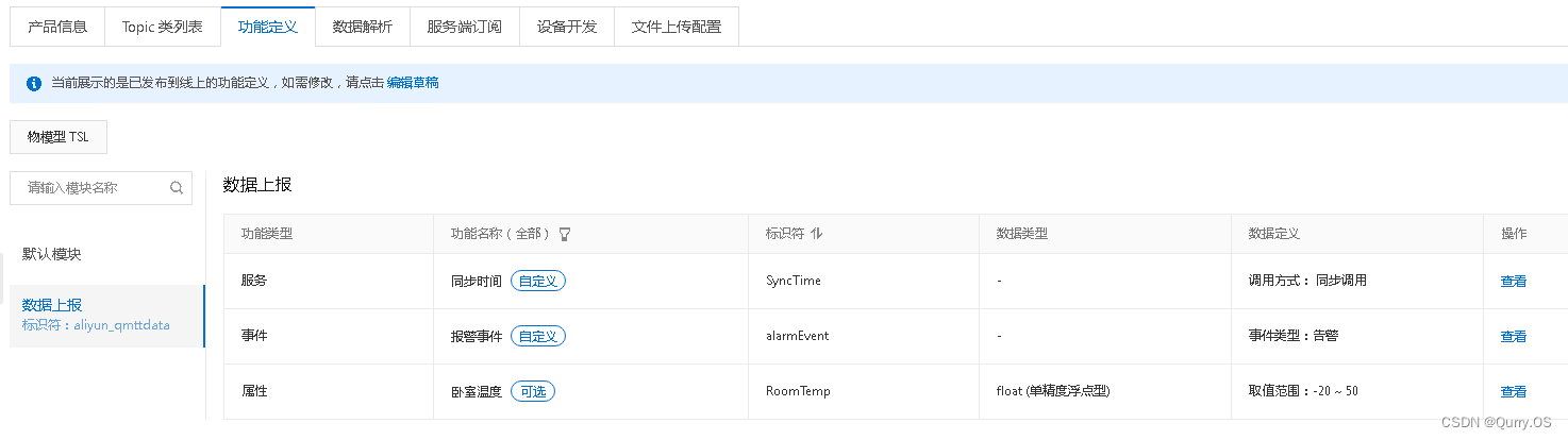 产品创建完成后,可以自定义一个物模型,用于建立设备与物模型的通信连接,物模型创建步骤;这里我创建了一个数据上报的物模型,其中温度的属性,标识符后面需要用到。
