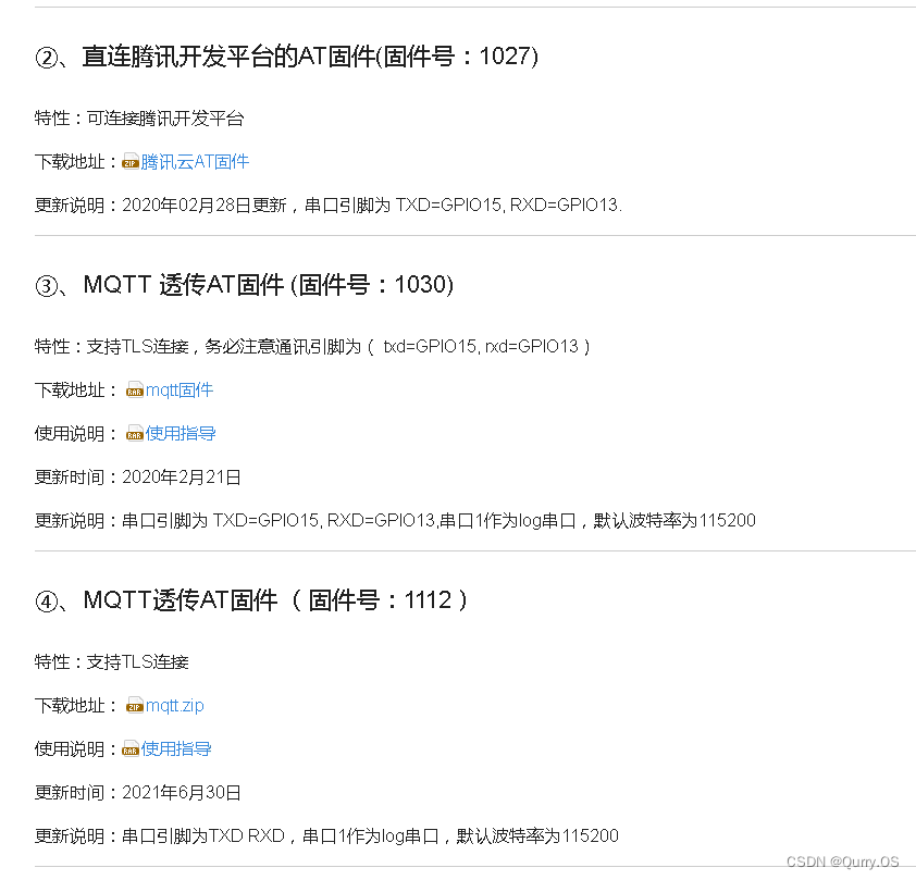 这里使用的是ESP8266系列,到安信可固件下载对应的AT固件即可,我们需要的是带MQTT协议的固件,相应的固件版本有使用说明,方便查看AT指令,一定要看说明,不同版本有些指令参数是不同的。