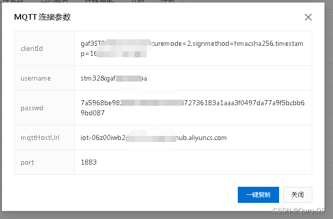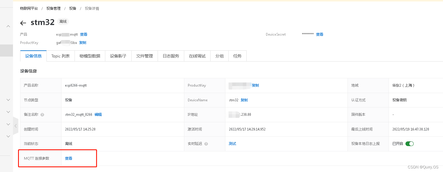 创建好产品设备之后,MQTT连接参数是我们后面软件开发需要用到的信息;