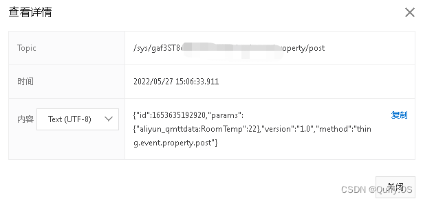 模块选择自定义创建的“数据上报”,然后设置发布卧室温度的值,发布成功后跳转查看云端日志,查看发布的具体内容,后面编写软件使用AT+MQTTPUB发布数据时就按照该内容的格式发送即可。