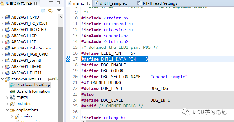 打开main.c文件,如下图所示添加#define DHT11_DATA_PIN 3,DHT11的数据口接开发板的PE4。同时在main文件中添加两个全局变量: