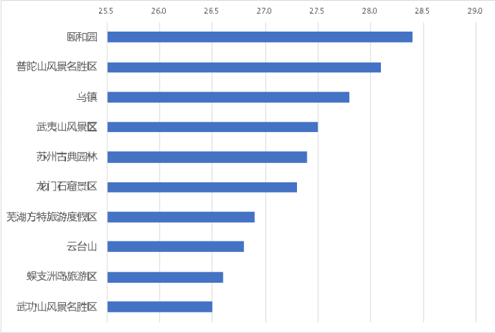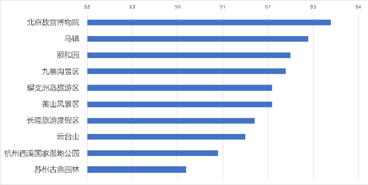 其中,得分排在前10位的5A景区有:北京故宫博物院、乌镇、颐和园、九寨沟景区、蜈支洲岛旅游区、黄山风景区、长隆旅游度假区、云台山、杭州西溪国家湿地公园、苏州古典园林。