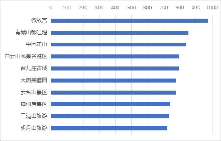 从2020年4月5A景区微信公众号的表现看,TOP10分别为:微故宫、青城山都江堰、中国黄山、白云山风景名胜区、台儿庄古城、大唐芙蓉园、云台山景区、神仙居景区、三清山旅游、明月山旅游。