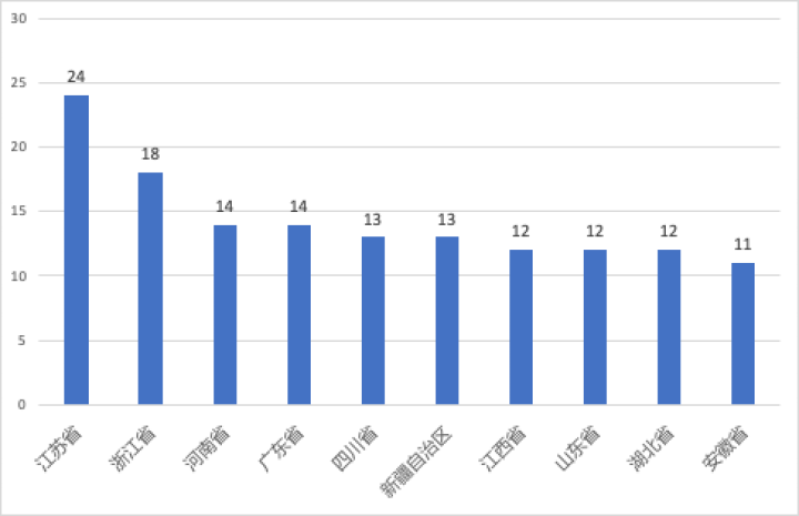 5A景区最多的省份是江苏省(24个),浙江省(18个)。处在5A景区数量TOP10的省份还有:河南省、广东省 、四川省、新疆、江西省、山东省、湖北省、安徽省。