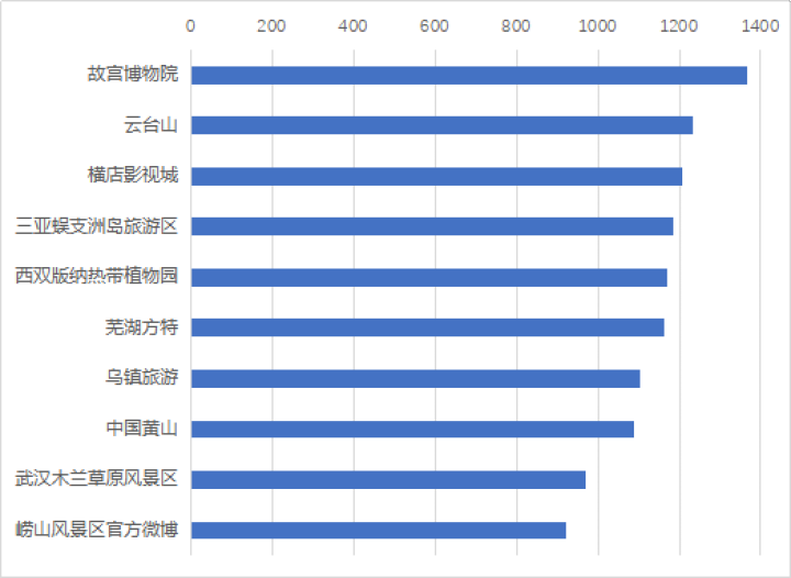 从2020年4月5A景区官方微博传播力来看,排在TOP10的是:故宫博物院、云台山、横店影视城、三亚蜈支洲岛旅游区、西双版纳热带植物园、芜湖方特、乌镇旅游、中国黄山、武汉木兰草原风景区、崂山风景区官方微博。