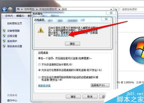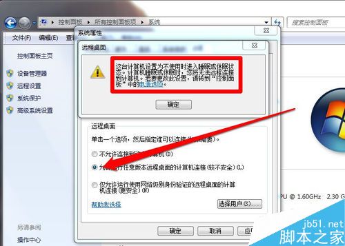 选允许远程桌面的计算机连接后,会弹出一个警告,
