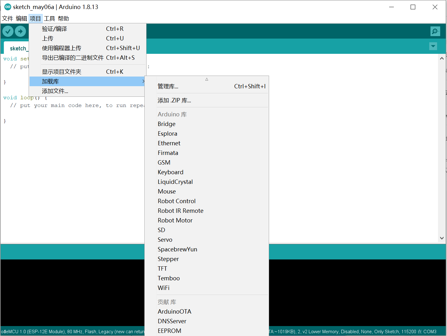 - 点击项目,会发现工具栏中的图标编译、上传也包含在其中。点击加载库,选择列表中的库文件后,编辑区自动添加相关的头文件。