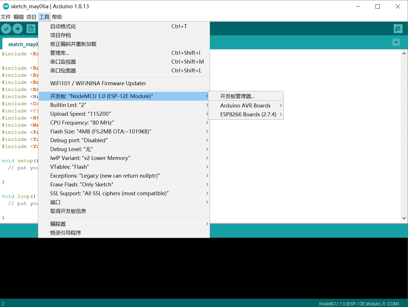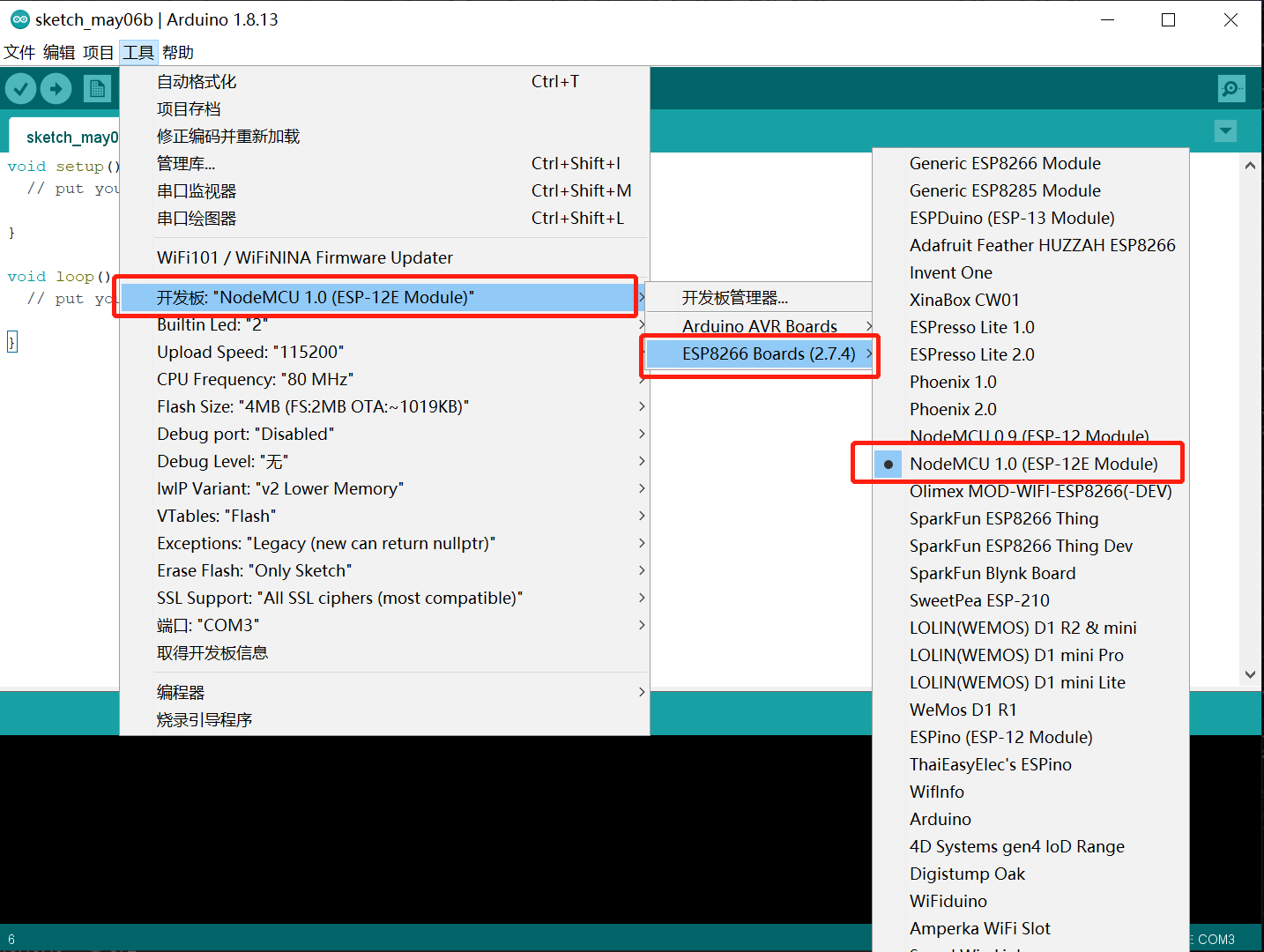 选择 工具->开发板->ESP8266 Boards->NodeMCU 1.0(ESP-12E Module),图示如下: