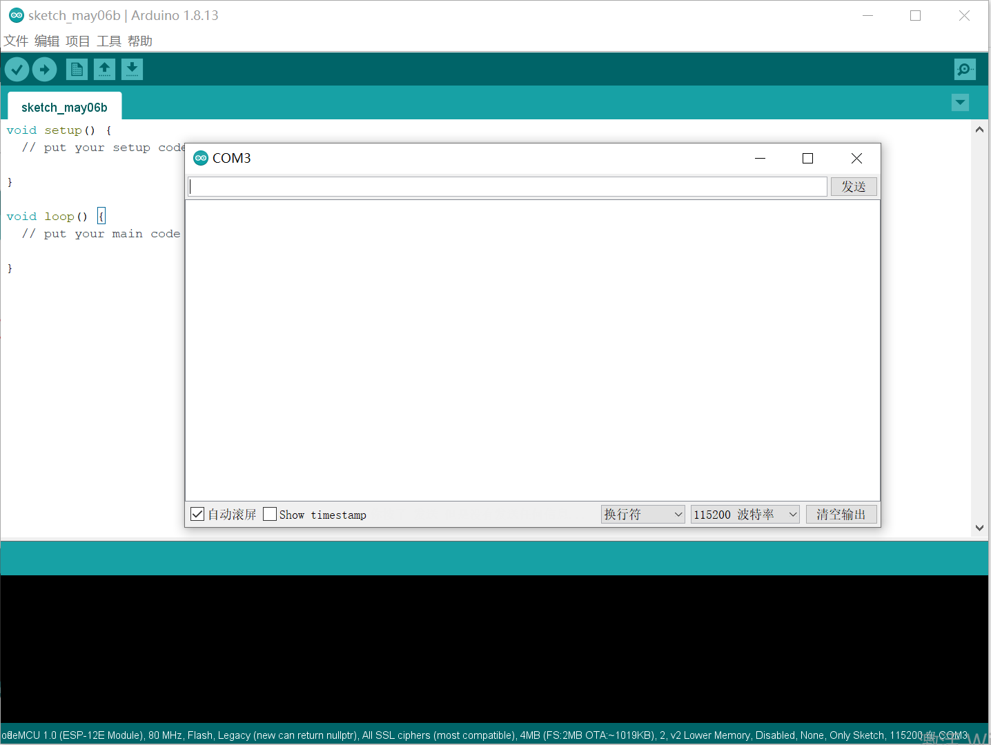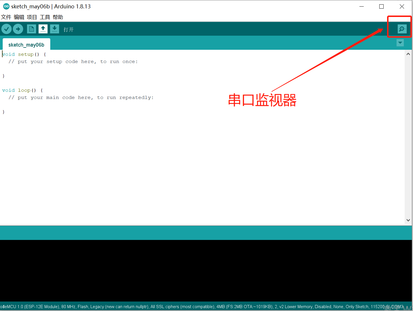 - 点击工具栏中的串口监视器,可启动IDE自带的串口监视窗口,此工具用于串口通讯,非常方便,后续学习经常用到此功能。