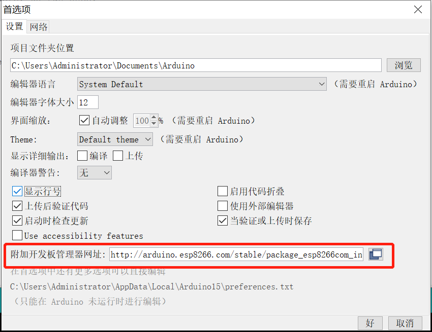 打开 文件->首选项,然后会看到附加开发版管理器网址,填入http://arduino.esp8266.com/stable/package_esp8266com_index.json,重启IDE,图示如下: