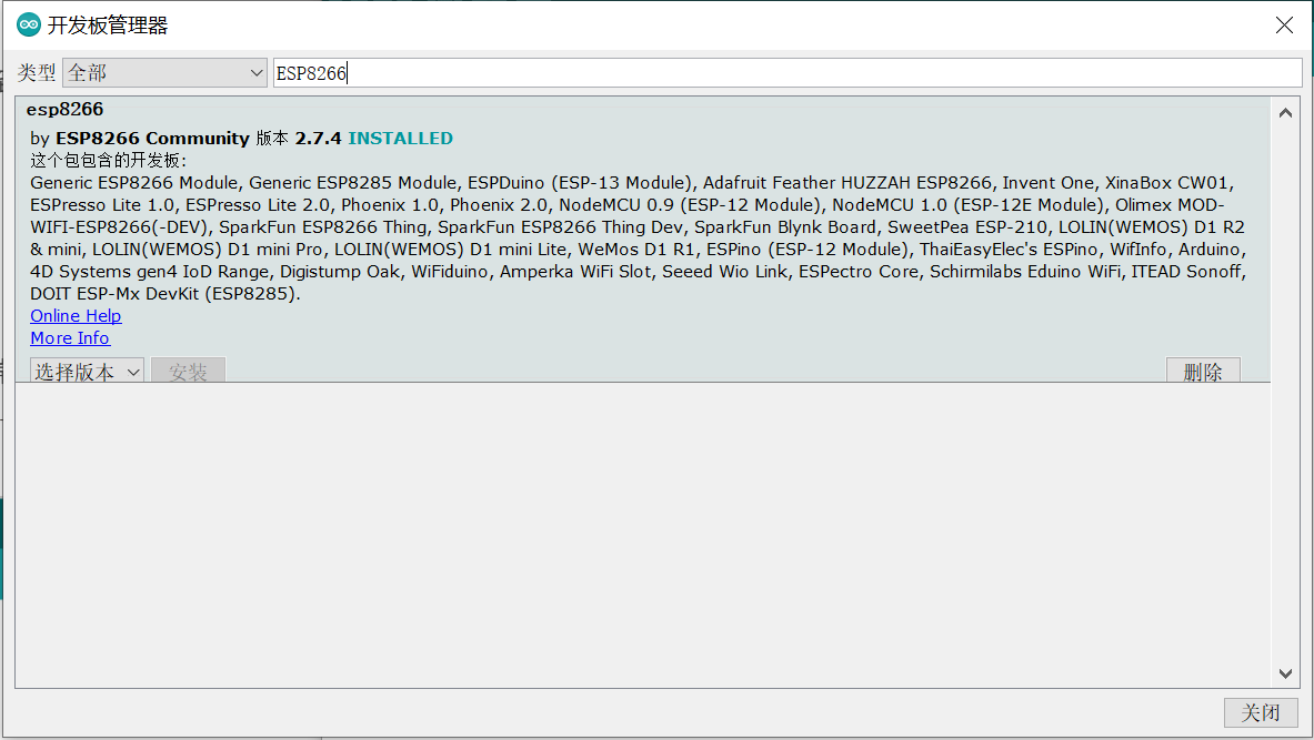 重启IDE之后,打开 工具->开发板->开发板管理器,在列表中找到ESP8266平台点击安装,安装完成后,图示如下: