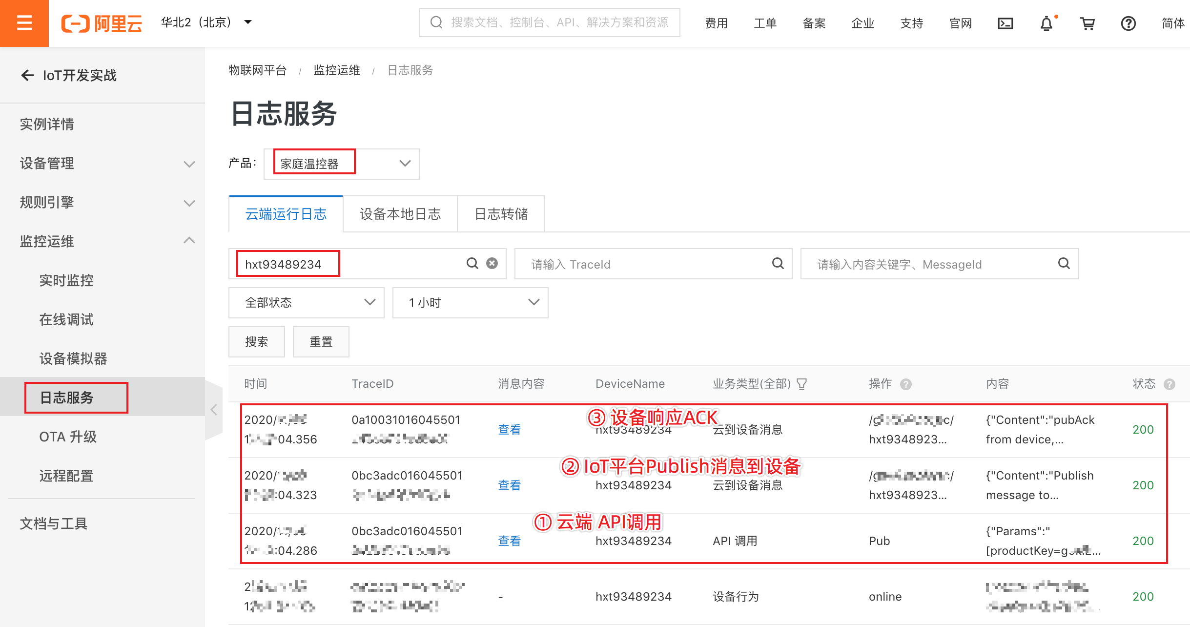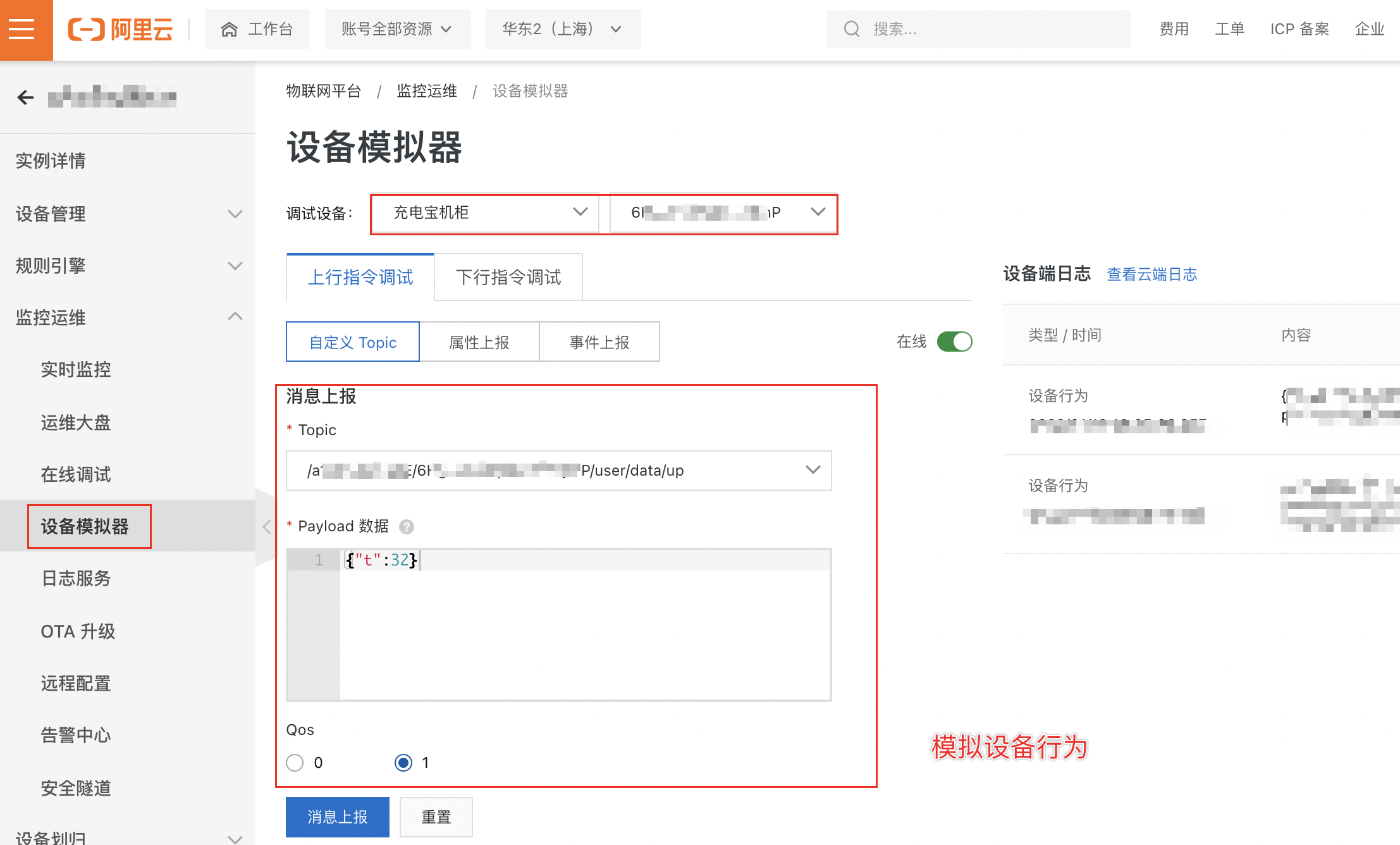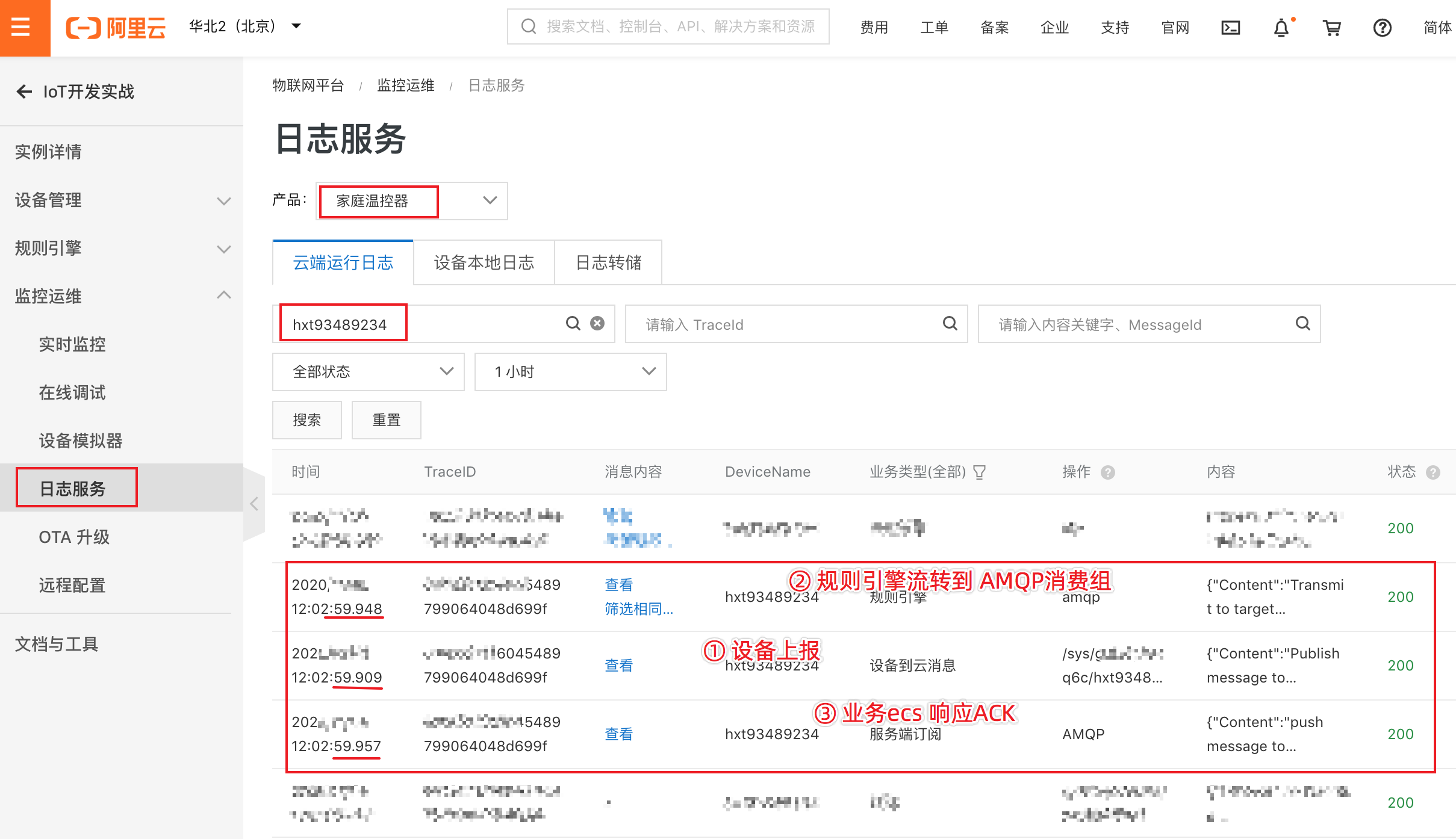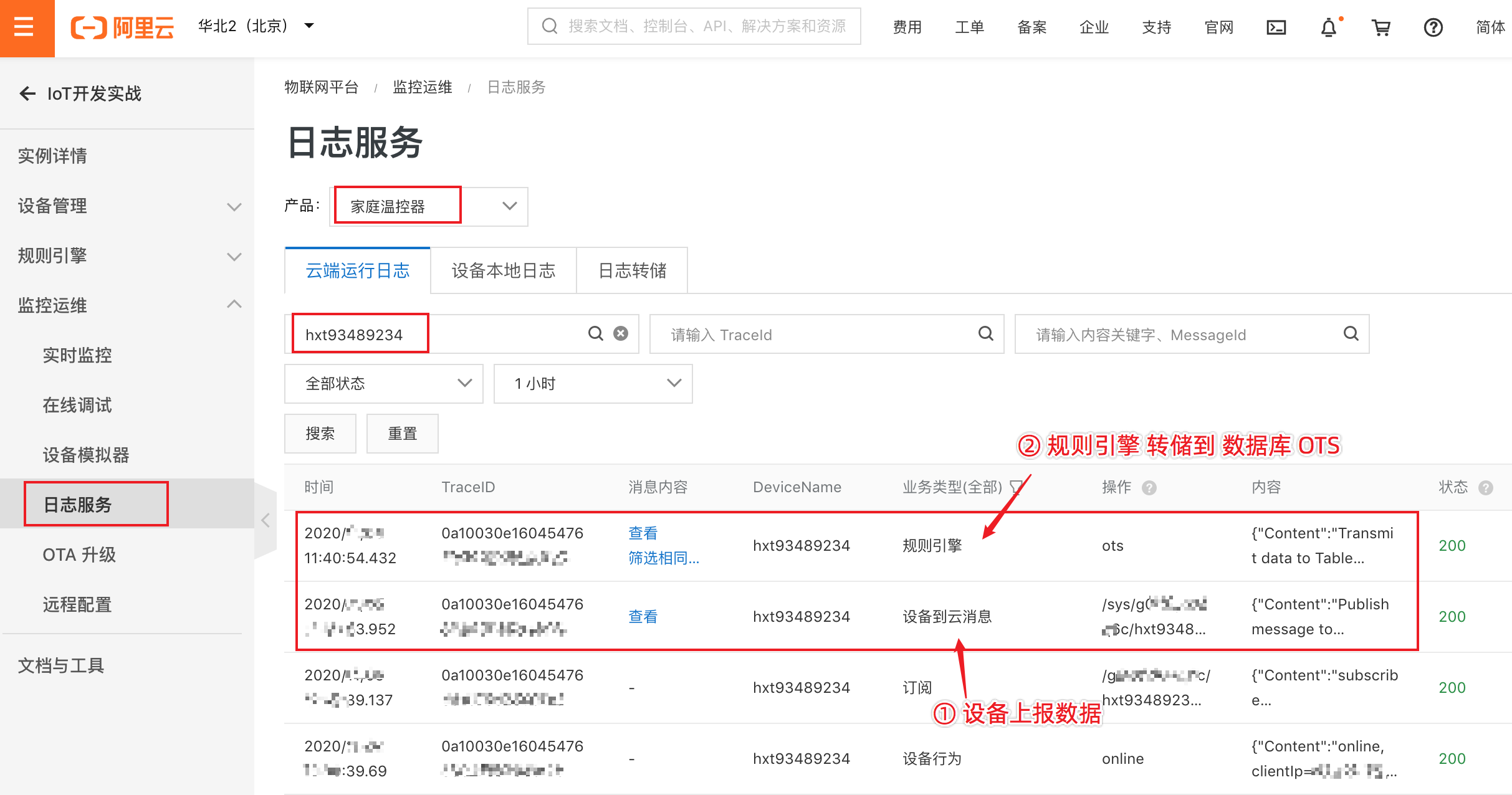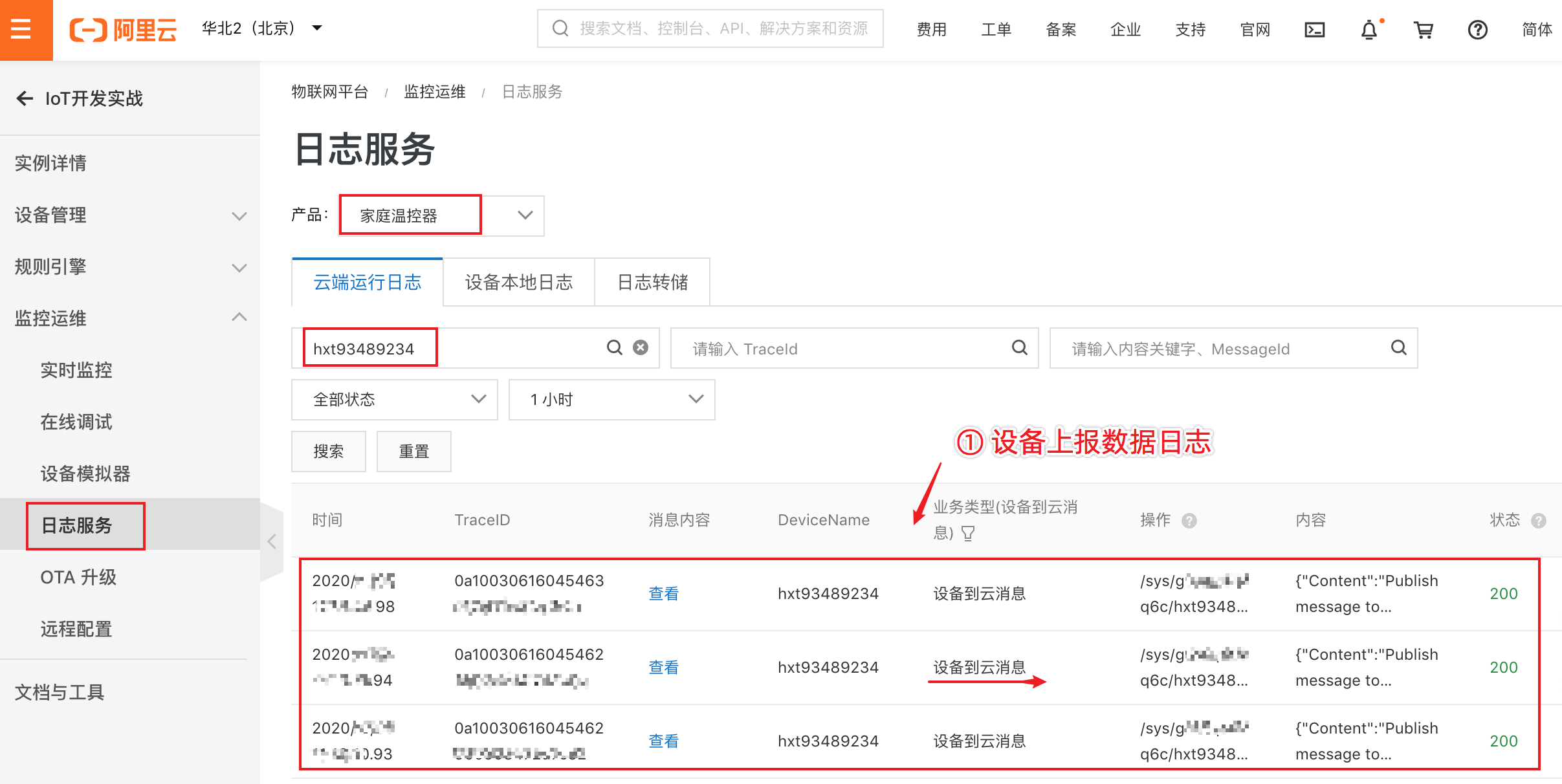 在监控运维的日志服务里,也可以看到设备上报数据的日志。如下图:
