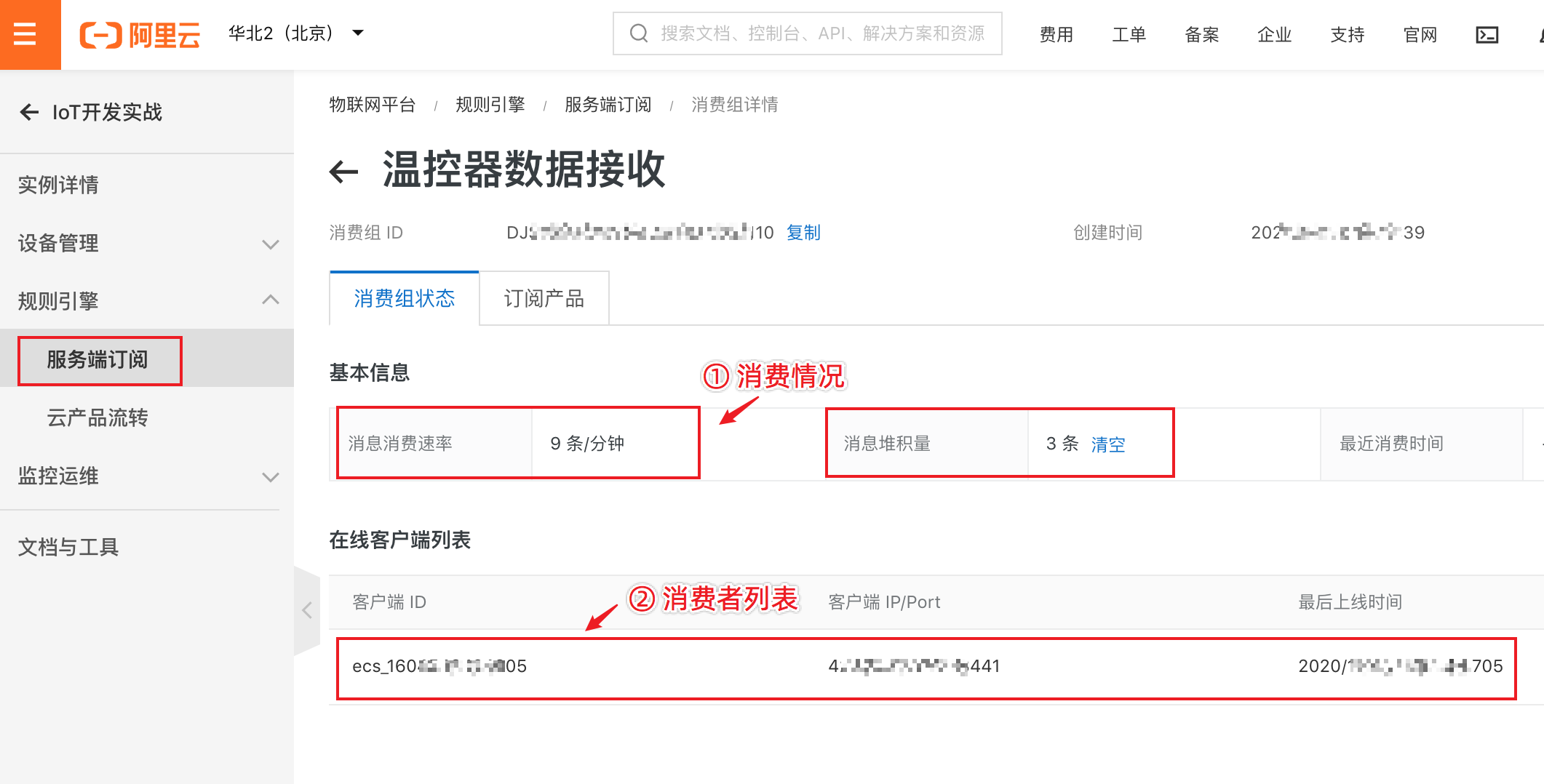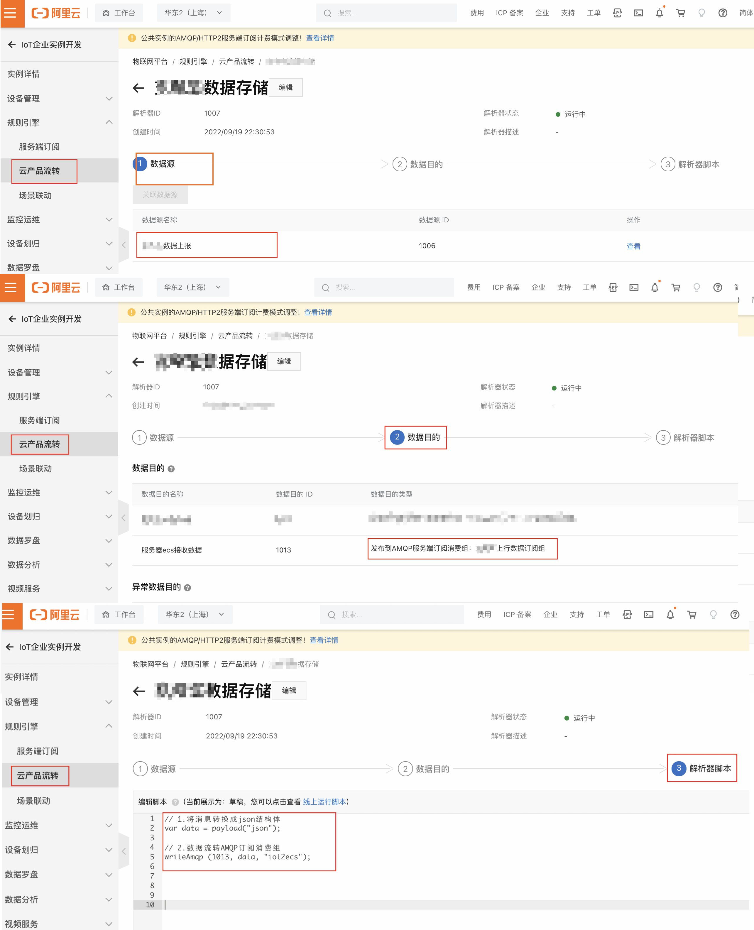 然后,我们在云产品流转中创建解析规则配置流转目的地为上面创建的服务端订阅消费组。
