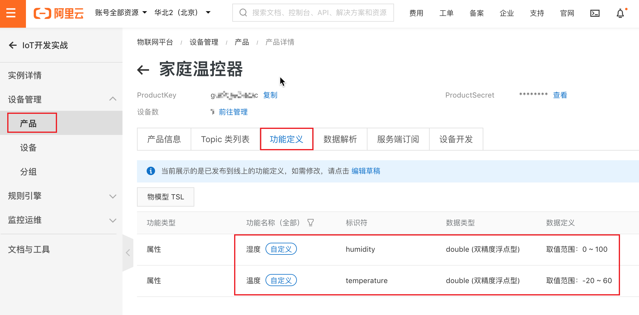 在产品的功能定义页面,我们添加温度和湿度两个属性,具体细节如下图:
