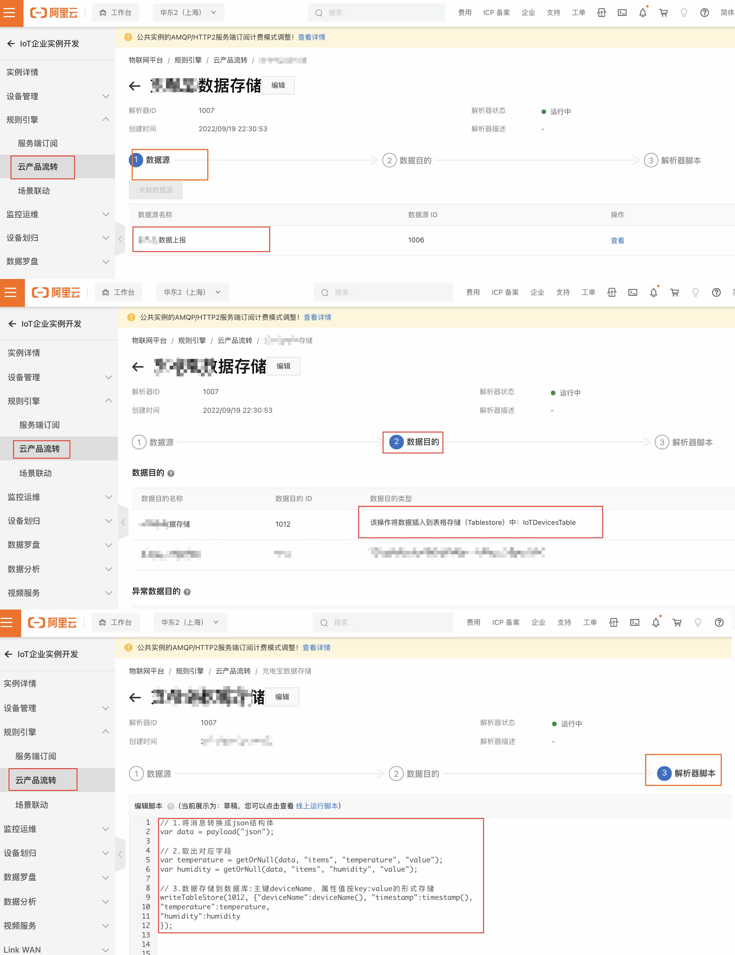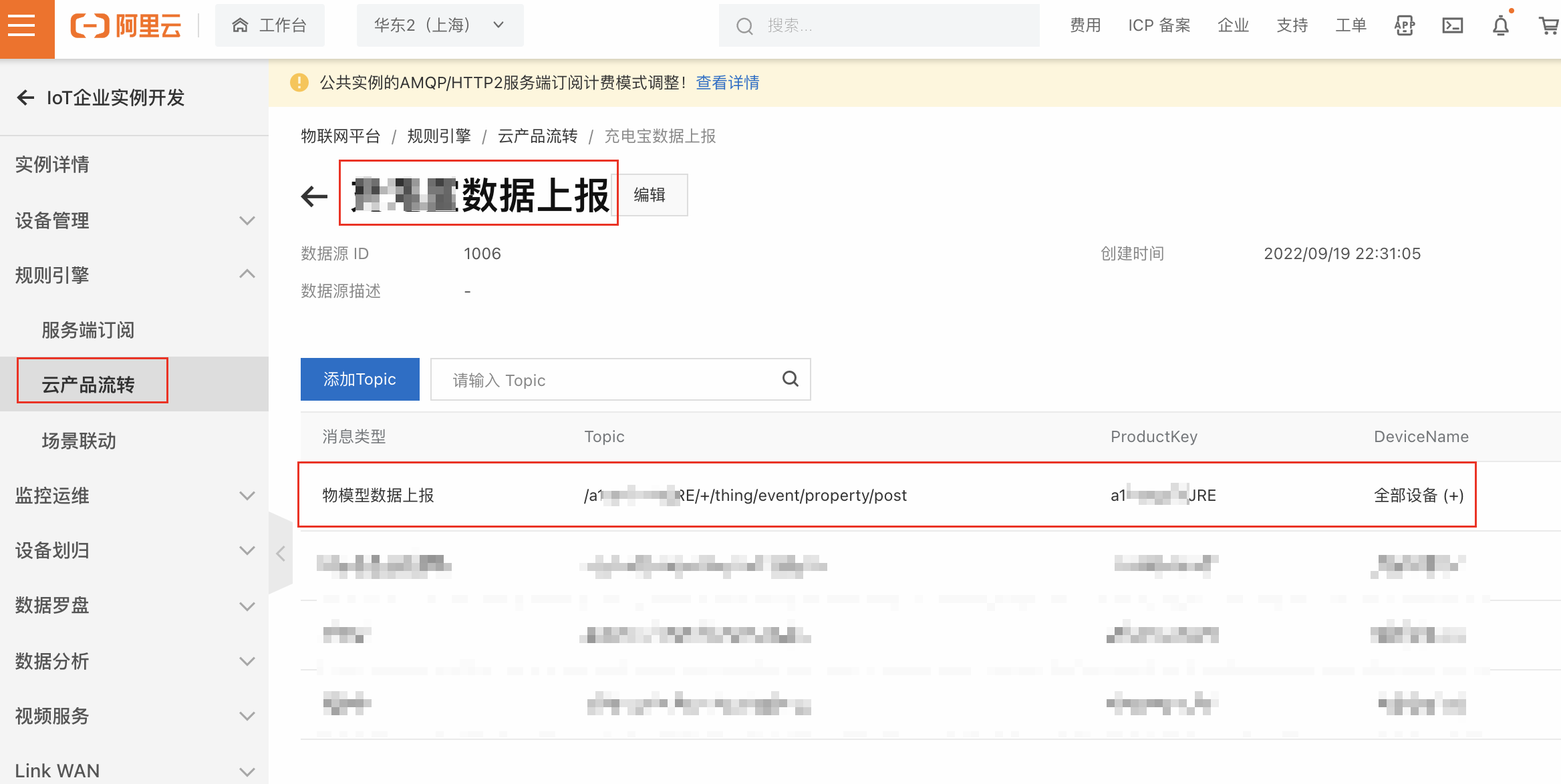 在IoT企业实例,云产品流转中创建规则引擎,编写数据处理SQL,配置流转目的地为上面创建的数据库表。