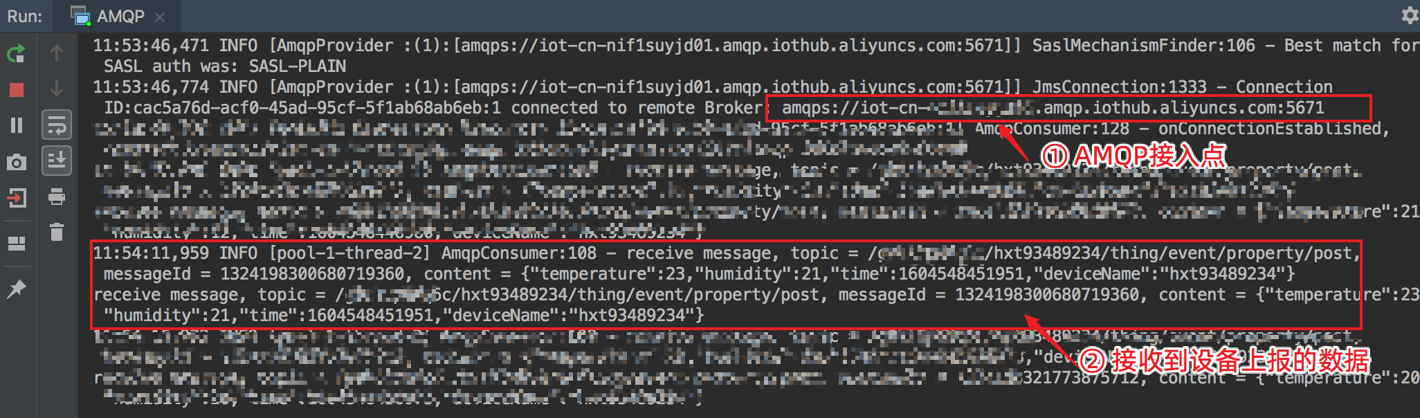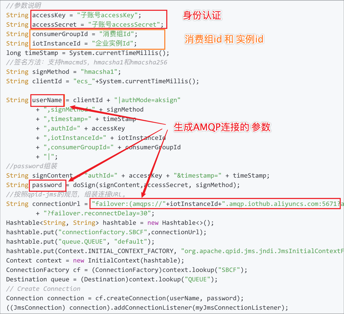 最后,我们在业务服务器编写程序,使用阿里云账号的AccessKey与IoT企业实例建立AMQP连接,参考代码如下: