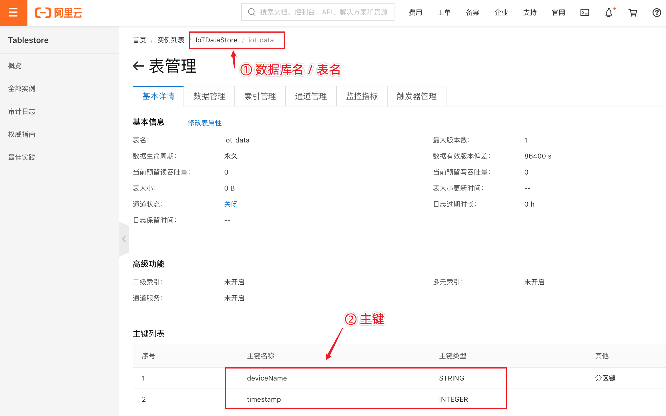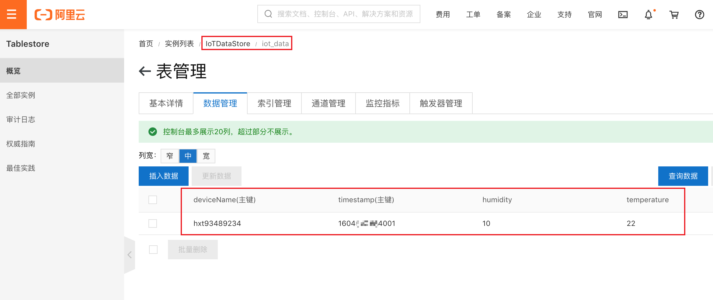 首先,我们创建一个表格存储实例 IoTDataStore,建立一张数据表iot_data,以deviceName和timestamp为主键。如下图: