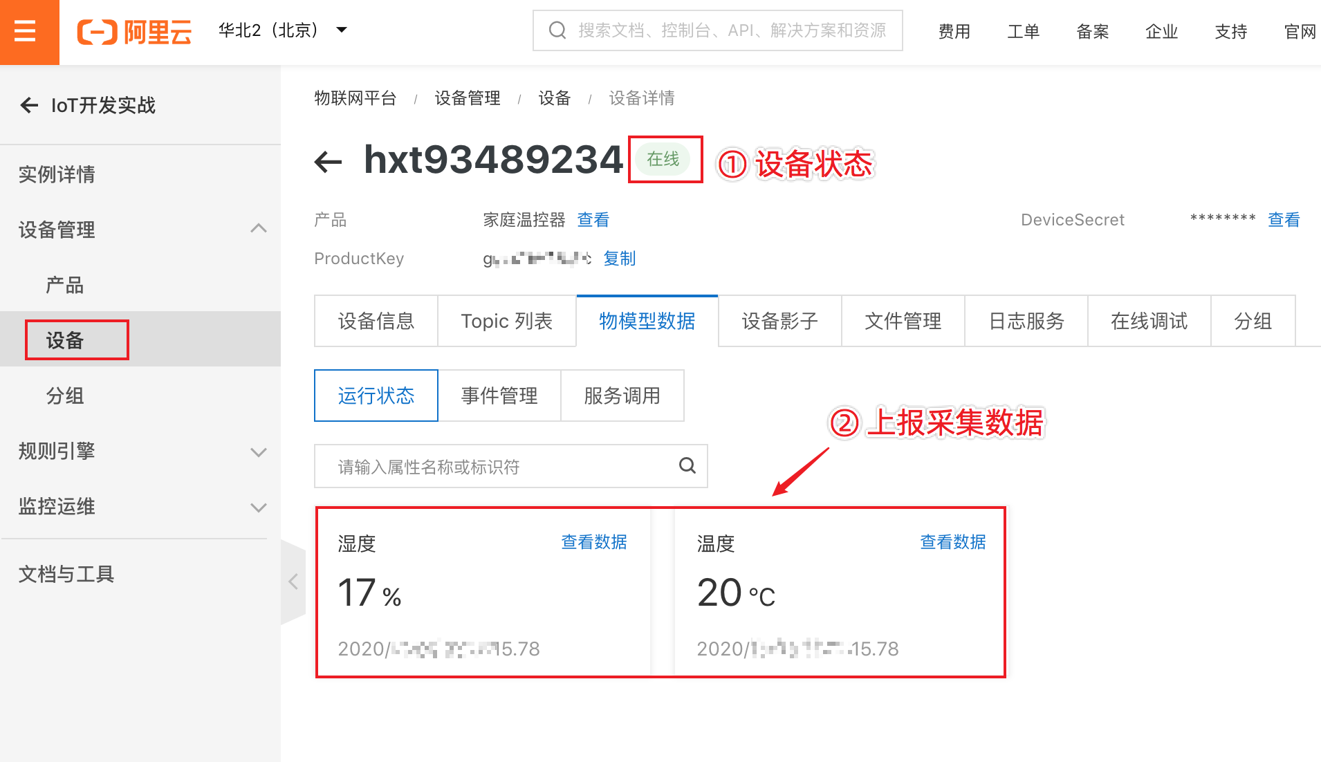 启动模拟脚本后,我们看到设备状态为在线,物模型数据中可以看到最新上报的温度和湿度值。