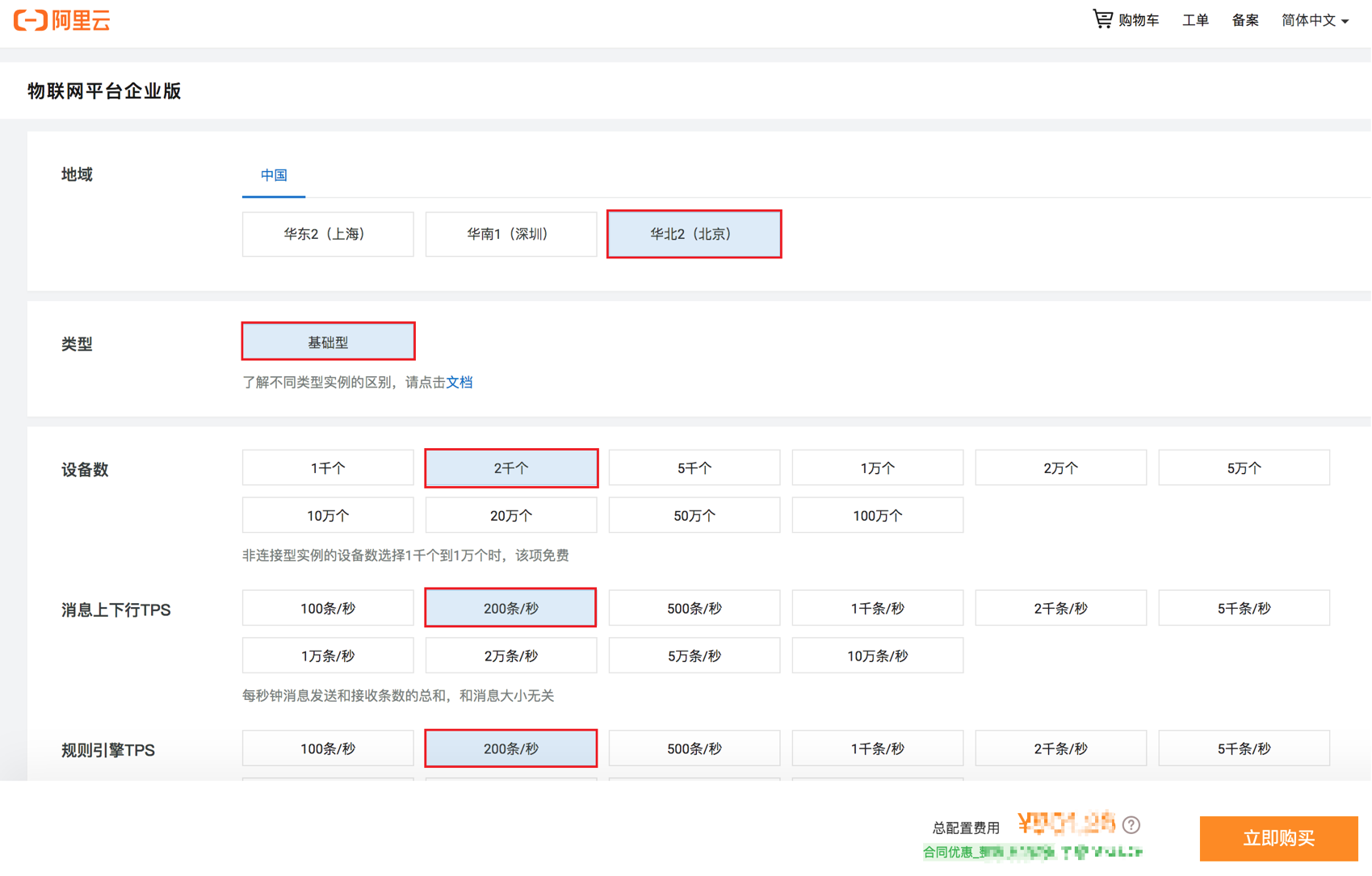 然后,在购买页面,根据实际业务需求,选择地域、实例类型、设备数量、消息上下行TPS、规则引擎TPS等参数,点击立即购买,付费成功后,即可看到企业实例创建中。