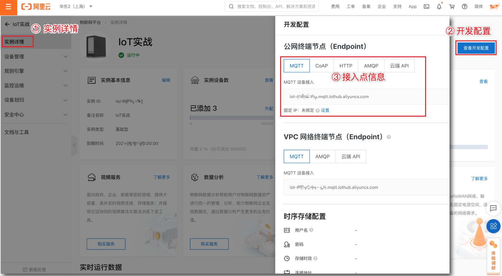 稍等几分钟后,企业实例创建完成。进入企业实例,我们可以看到当前规格参数,设备接入点信息,AMQP订阅接入点信息,云端API调用接入点信息。如下图: