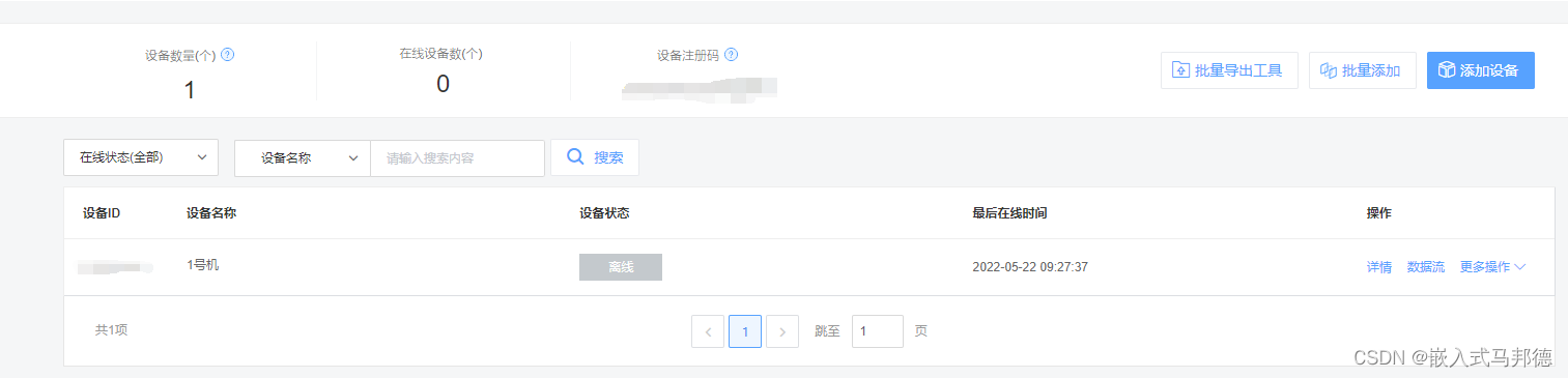 首相是注册一个平台账号,然后再登录,之后就是创建设备,在创建设备这里使用的是多协议接入设备(相关注册与数据流之类的详情就不在赘述)。下面是注册好之后的效果图。