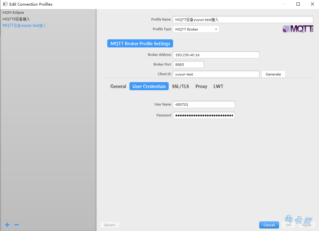 | Broker Address | Broker Port | Client ID | User Name | Password | 说明 |