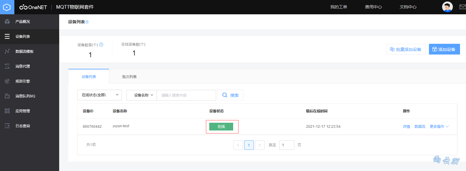 此时onenet平台控制台中设备处于 “在线” 状态