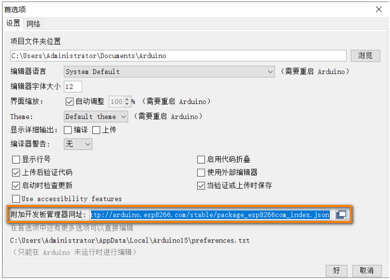 (1)文件菜单下的首选项对话框的附加开发板管理器网址,输入: