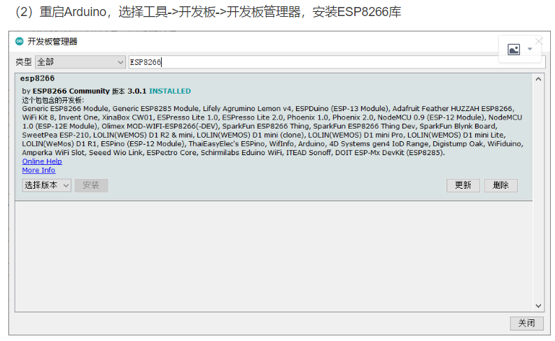 (2)重启Arduino,选择工具->开发板->开发板管理器,安装ESP8266库(此过程会比较慢,可以多试几次,或者找一下离线版安装指南)