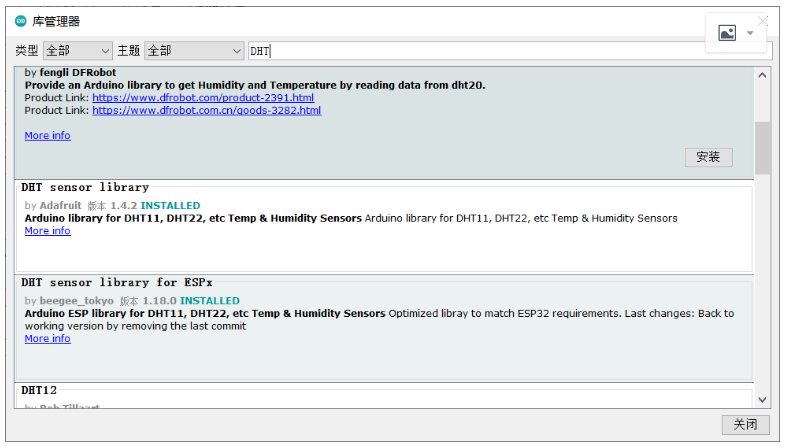 安装DHT sensor library 和 DHT sensor library for ESPx等DHT所需库文件