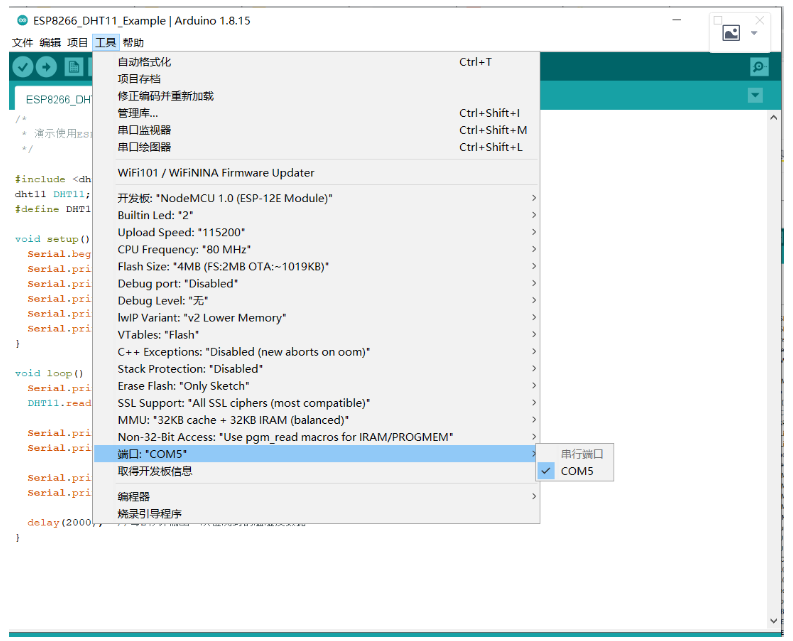 注意:端口要根据实际电脑中安装好ESP8266开发板驱动后分配的串口