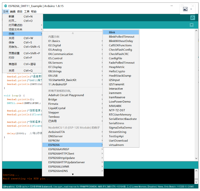 2. 打开ESP8266库自带的案例程序blink(这个要在ESP8266库安装好以后才能看到的)
