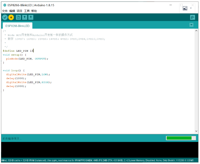 可以看出,Arduino IDE对ESP8266开发的支持还是很友好的,和Arduino程序开发没什么不同。可以通过以下通过ESP8266开发板控制LED灯亮灭的程序来感受一下使用Arduino开发ESP8266程序的简洁之处。