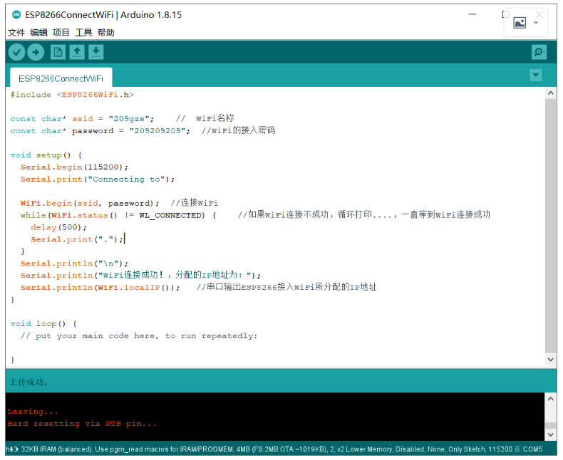 以上代码在使用时,要注意吧ssid修改为接入的WiFi路由器名称,password修改为接入密码。
