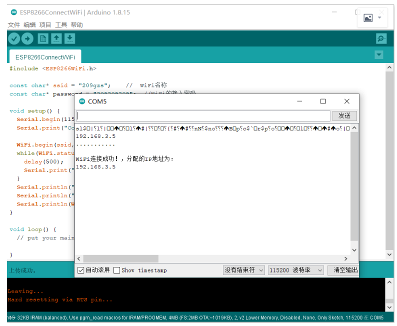 代码下载到ESP8266开发板以后,打开串口监视器时,通过串口输出的调试信息可能已经结束,此时,可以按一下ESP8266开发板的复位键,让ESP8266重新启动,就可以看到WiFi连接成功所获得的IP地址了。