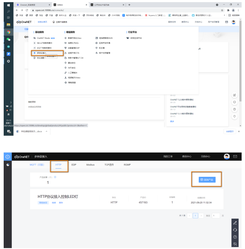 选择全部产品服务->基础服务->多协议接入,添加产品(注意要选中HTTP协议:后面的案例都是采用HTTP协议进行数据的传输)
