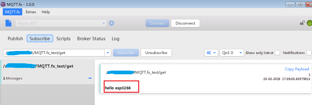 点击确认,我们在MQTT.fx中就会接收到订阅的消息