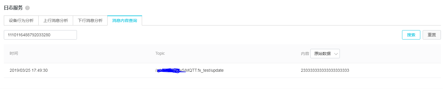 拷贝MessageID到消息内容查询,搜索可以看到MQTT.fx设备发送过来的消息