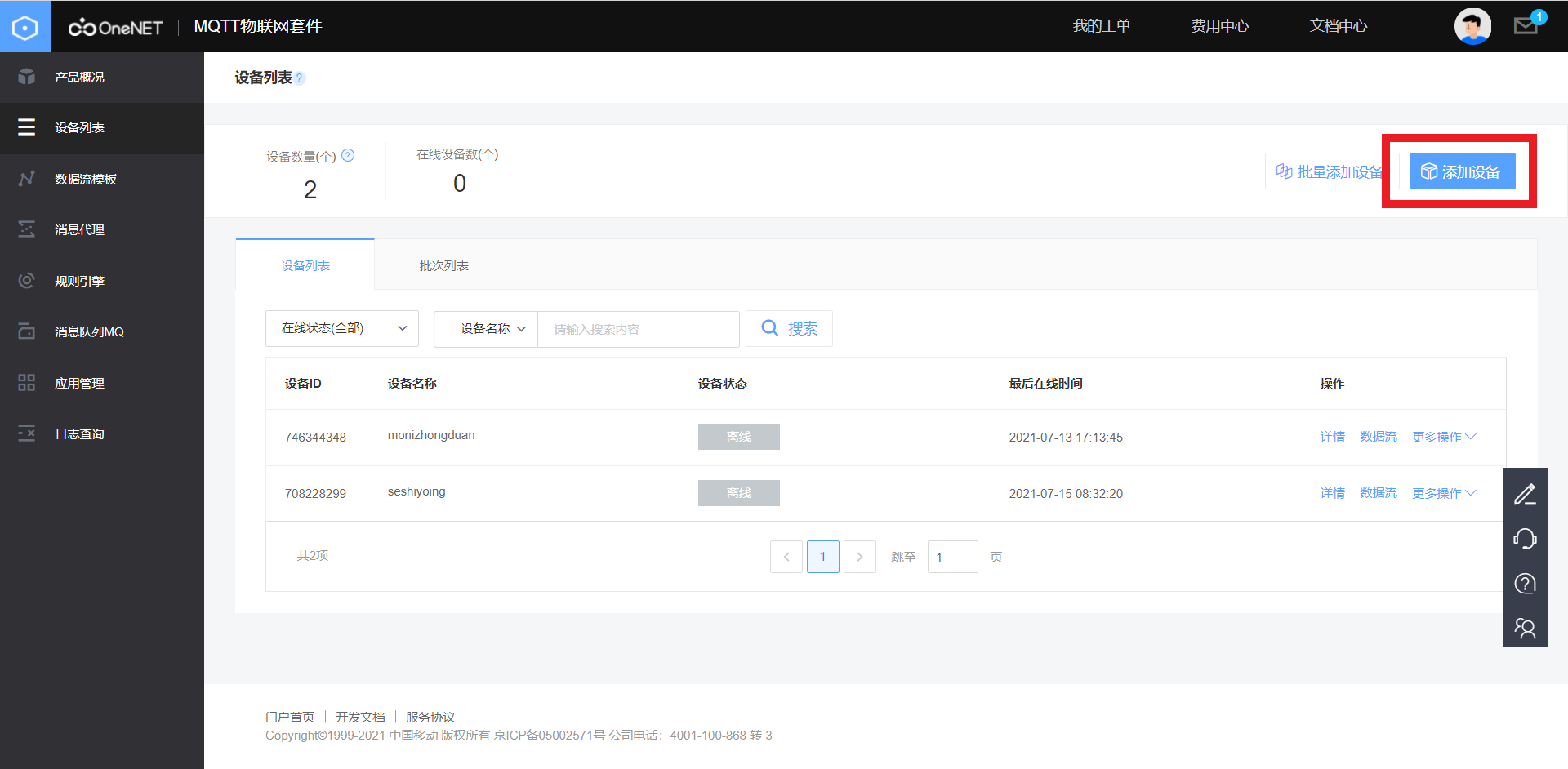 至此我们的配置工作就完成了,等待设备与ONENet连接上线就可以了。