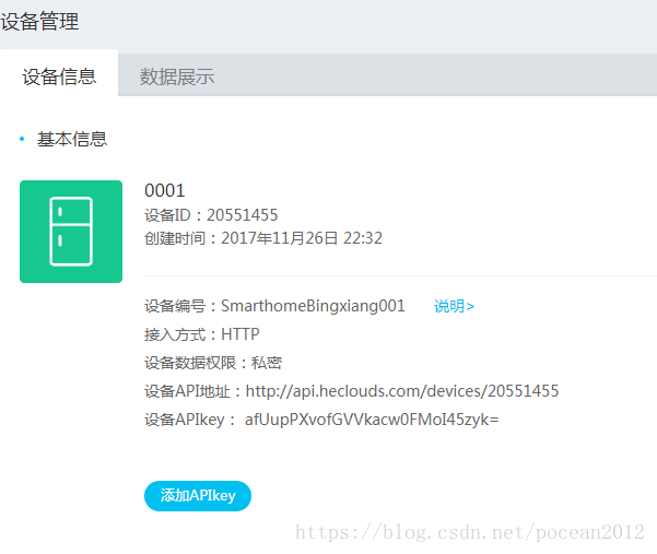 2. 查看设备详情,主要用到的参数:设备ID,API-KEY,另外要建立数据流