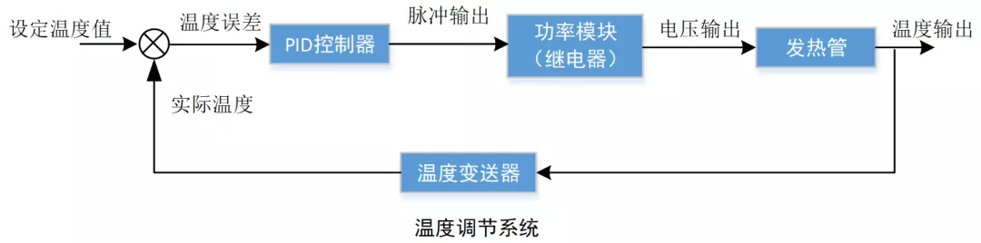 该温度调节系统的作用是让锅炉内的温度保持稳定,设计的温度调节系统基本原理如上图所示,在每个扫描周期,PLC会计算设定温度和实际温度之差,然后将温度误差作为PID控制器的输入进行计算,计算结果转换为一定占空比的脉冲输出,进而控制功率模块,最终输出电压控制发热管,保持炉内温度稳定。PID控制器可以让整个系统达到一定的控制要求(动态误差、静态误差、超调、稳定时间等),让系统调控能够更加快速稳定。
