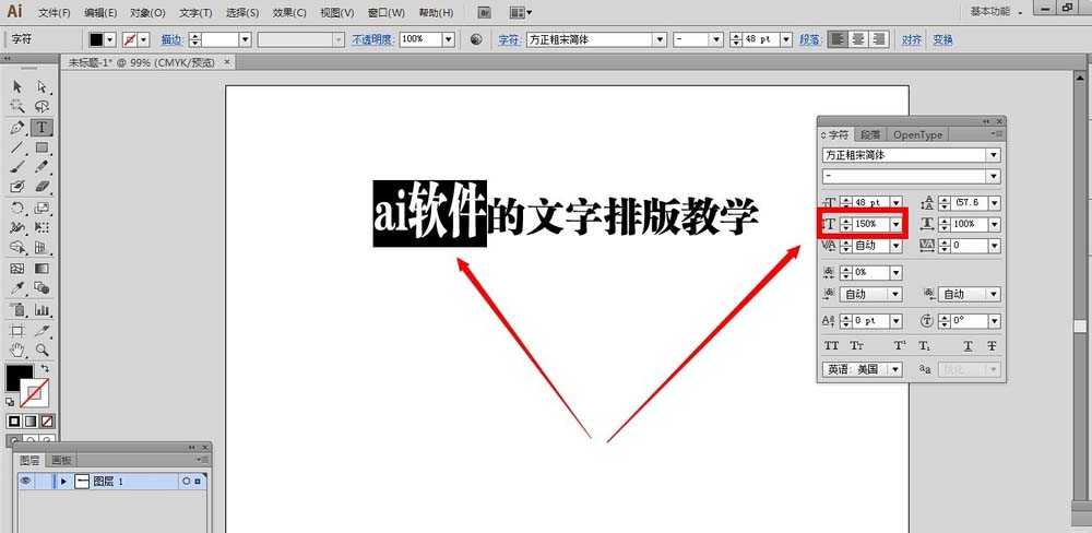 6、刚才是全部文字内容设置,如果想要让文字内容的某几个字,某部分缩放呢?选择文字工具,然后选中想要设置的文字内容