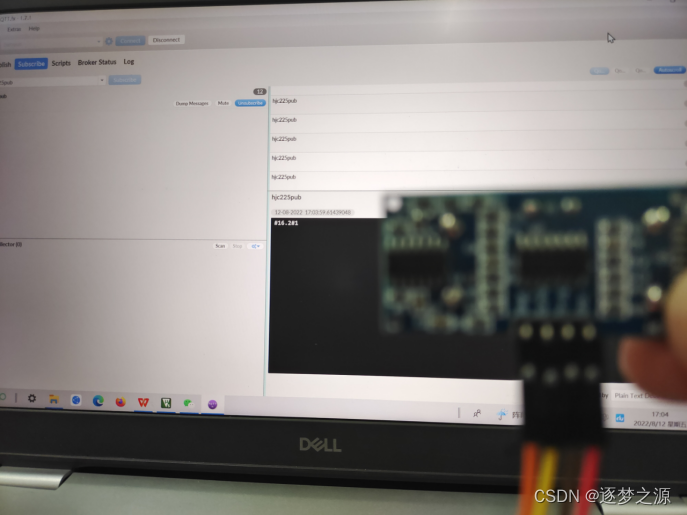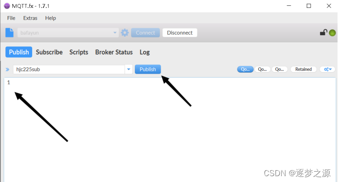 将代码烧录进单片机,然后上电,打开MQTT.fx,连接服务器,输入单片机接收数据主题(这里是hjc225sub,注意改成自己的)