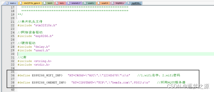 - esp8266.c文件中ESP8266_WIFI_INFO,参照格式修改成所需要连接的WIFI即可,使用巴法云,ESP8266_ONENET_INFO不用修改
