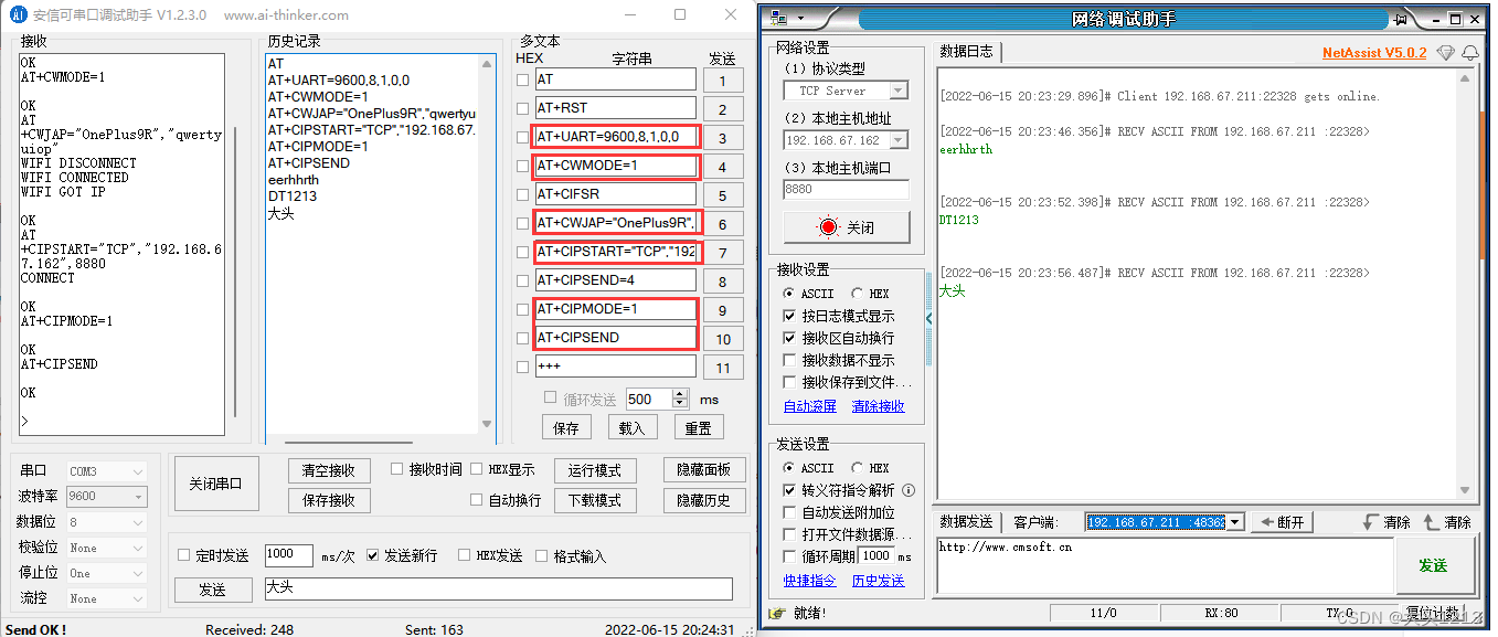 以设备模式接入路由器配置,发送AT+CWJAP="OnePlus9R","qwertyuiop"指令