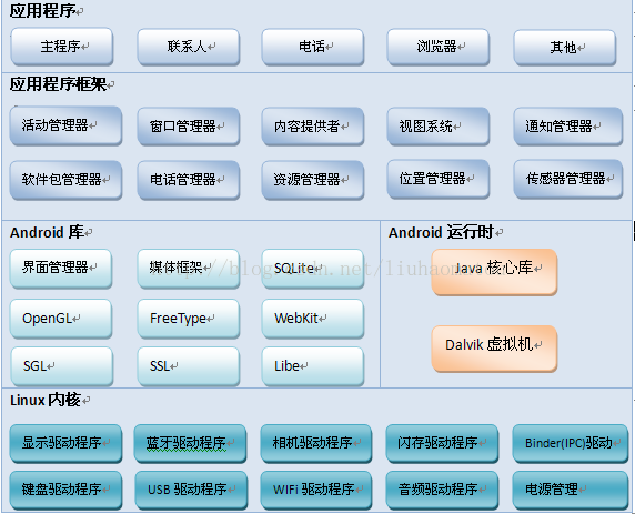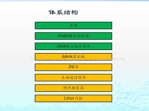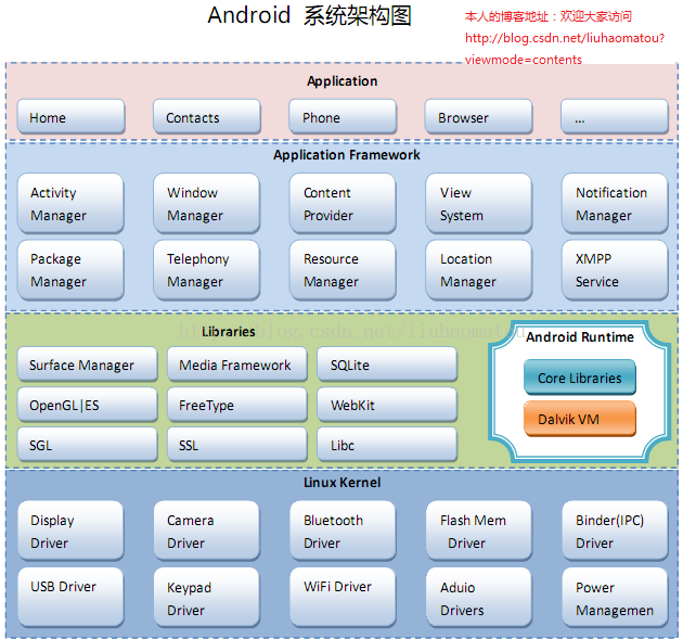 在了解WIFI模块的系统架构之前。我心中就有一个疑问,那么android的系统架构是怎样的呢。其实现在网络中有很多关于android系统架构的描述和解释,在这里我不做详细的研究了,只是贴张图重新温故一下。具体细节还要查看android源码,多问度娘和google大神。