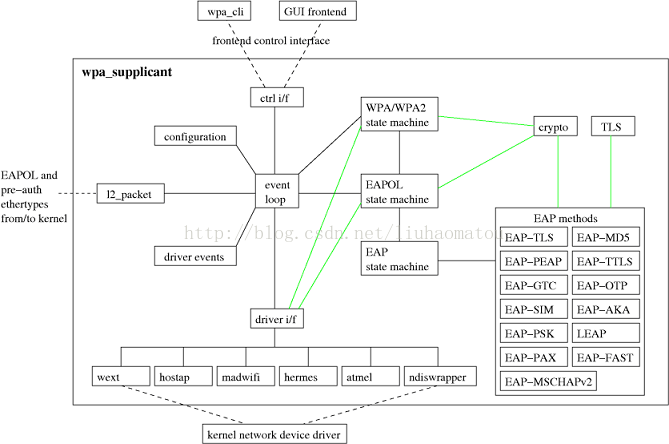 wpa_supplicant本是开源项目源码,被谷歌修改后加入android移动平台,它主要是用来支持WEP,WPA/WPA2和WAPI无线协议和加密认证的,而实际上的工作内容是通过socket(不管是wpa_supplicant与上层还是wpa_supplicant与驱动都采用socket通讯)与驱动交互上报数据给用户,而用户可以通过socket发送命令给wpa_supplicant调动驱动来对WiFi芯片操作。 简单的说,wpa_supplicant就是WiFi驱动和用户的中转站外加对协议和加密认证的支持。