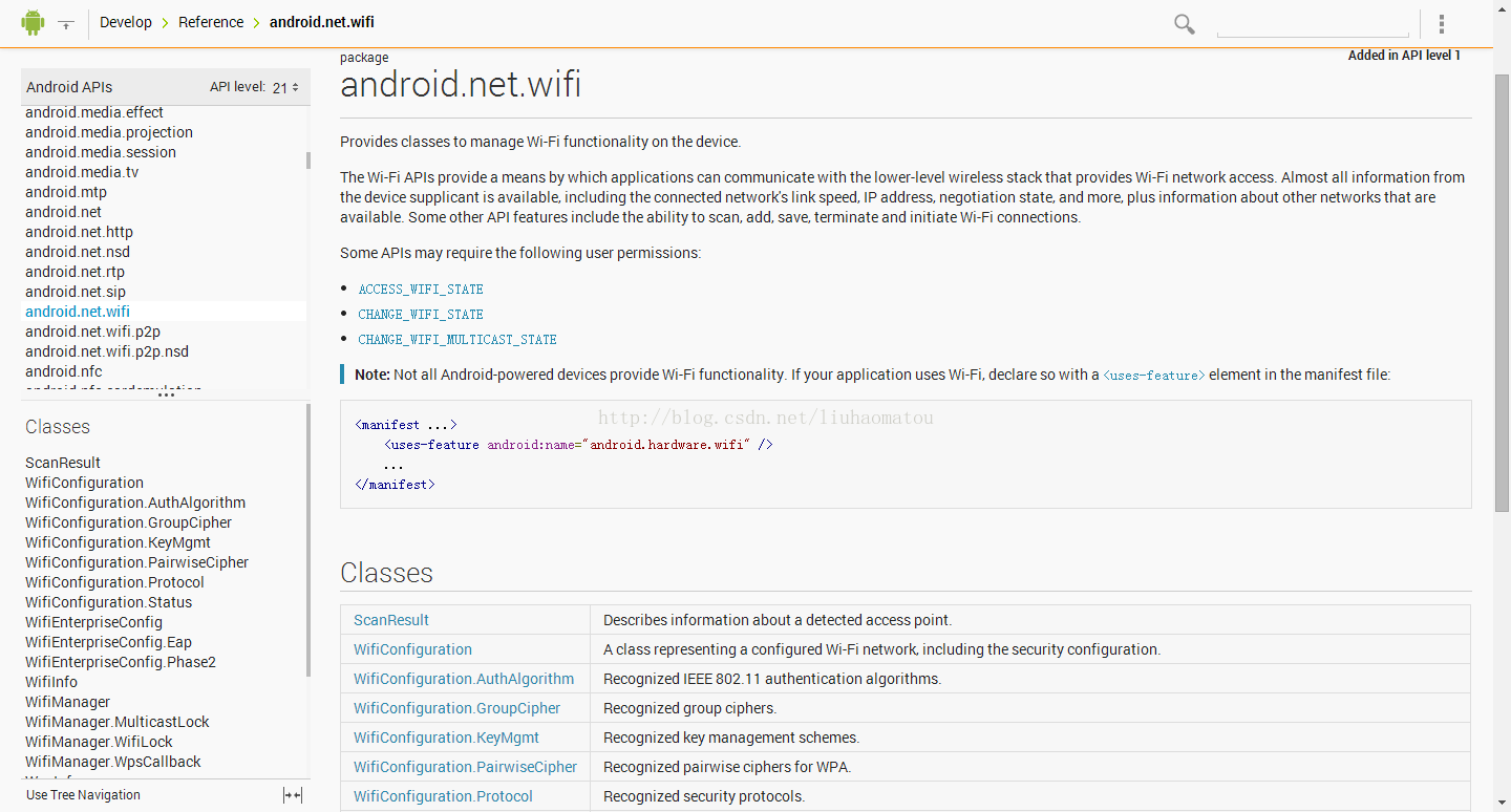 在Android里,所有的wifi操作都在android.net.wifi包里,而常用的类也就只用几个,对于一般的开发人员来说,常用的操作也是有限的,不需要刻意的去记,用的时候现查就ok了。以下是官方API 网址: