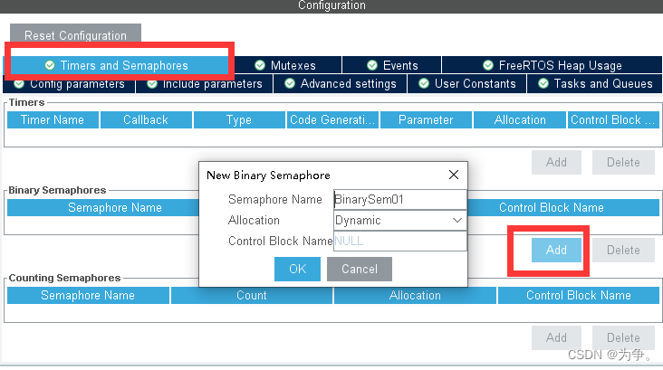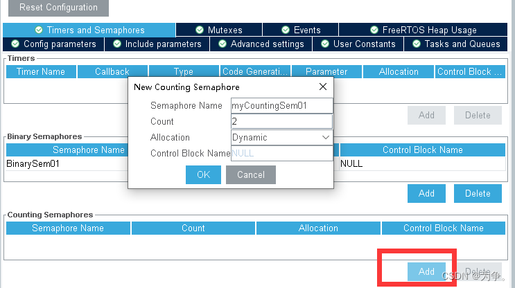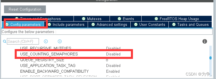 如果想要创建计数信号量Counting Semaphore,必须在 Config parameters 中进行使能。