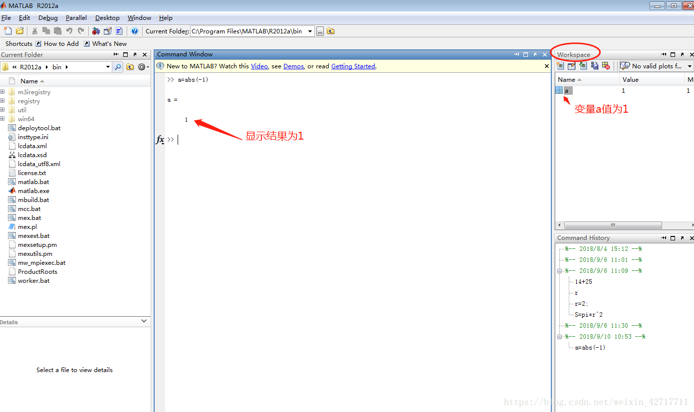 每个函数在Command Window中运行,用来完成特定的计算任务,运行方式是输入“输出变量=函数名(输入变量)”,然后按回车。例如有个系统自带的函数是用来求绝对值的,函数名abs,所以在Command Window里输入“a=abs(-1)”,就会显示运算结果为“a=1”。且运算结果会在Workspace里出现一个变量a,双击后可看到a的值是1。